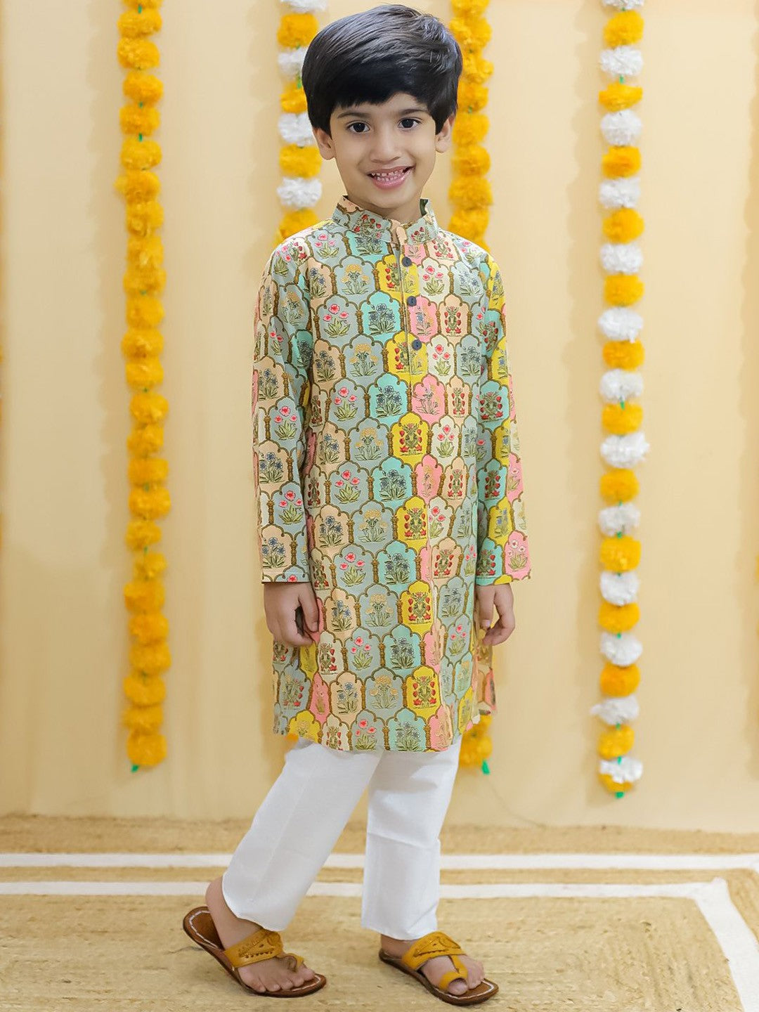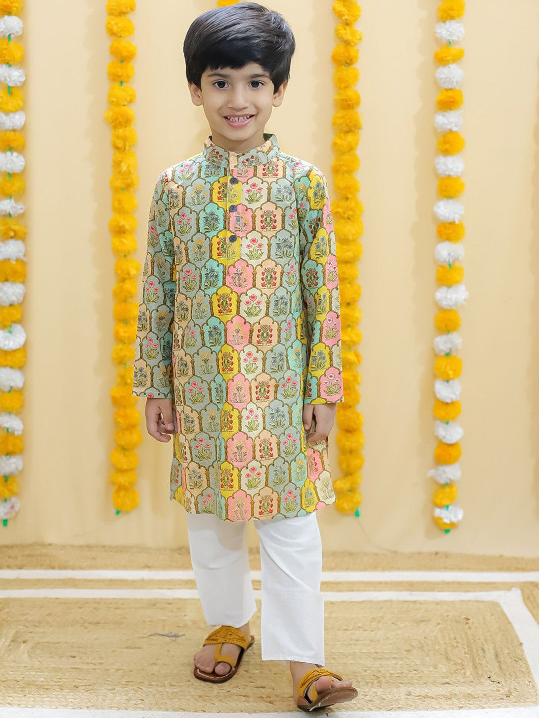 Boys Ethnic Floral Printed Pure Cotton Kurta with Pajama and Nehru Jacket